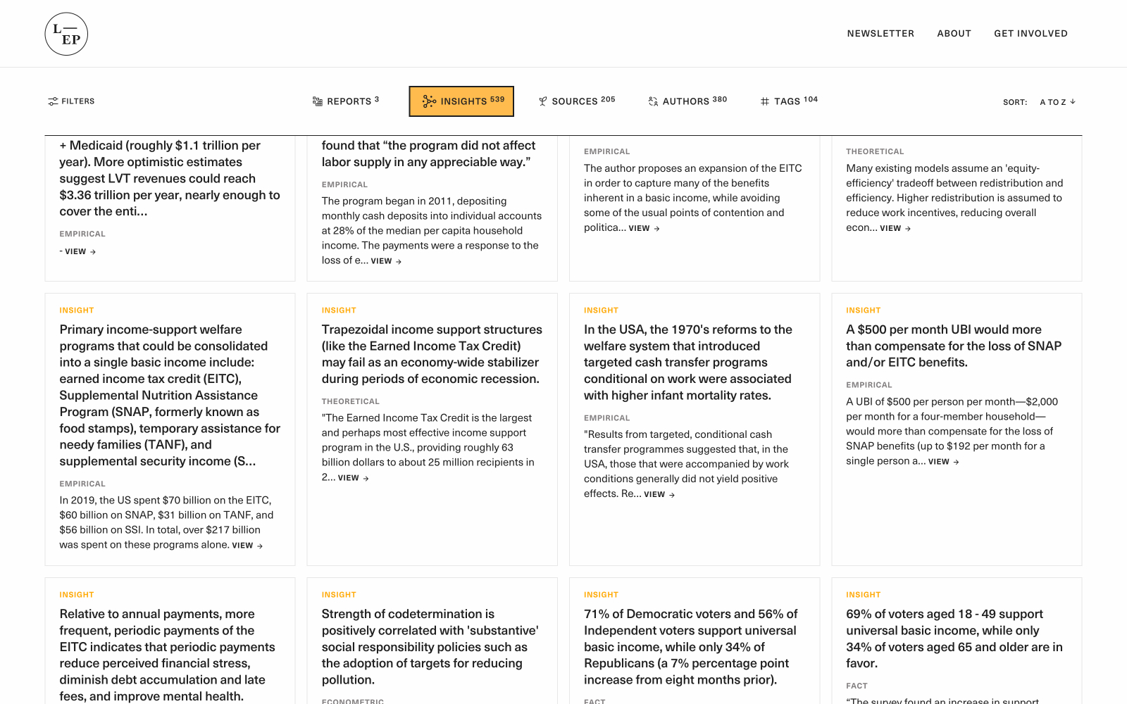 The knowledge system itself was made up of a five building blocks: reports, insights, sources, authors and tags—all bi-directionally linked to create pathways between them.
